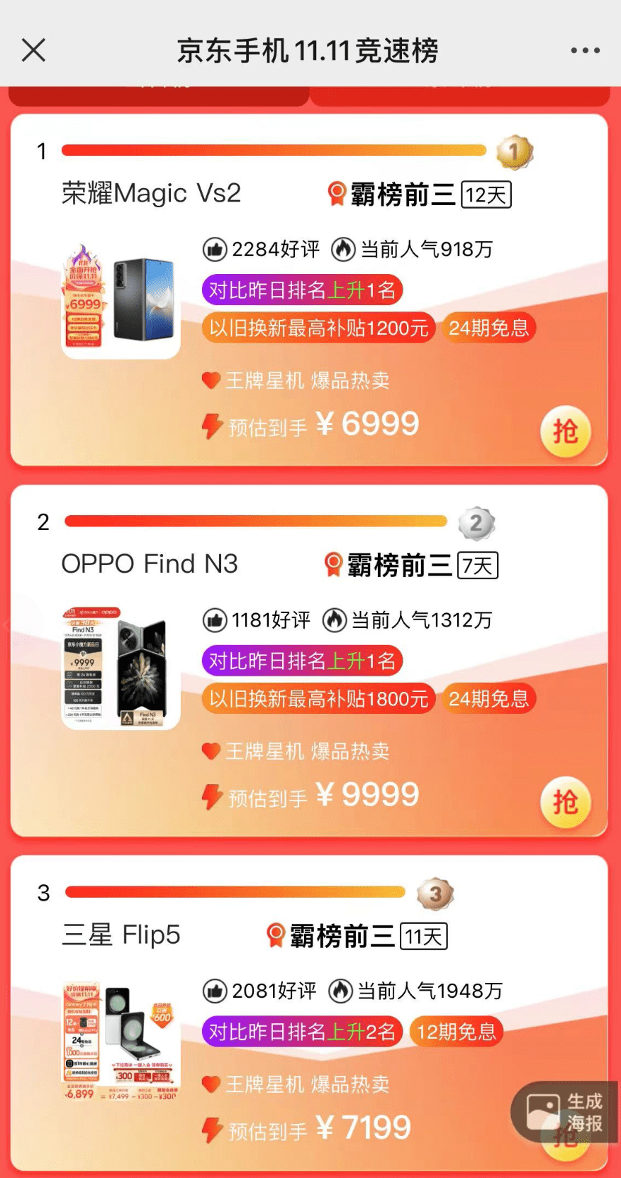 国产折叠屏都把三星甩到后面去了?支棱起来了啊!刚看了下京东手机双11竞速榜,其中在折叠屏这个领域,国产折叠屏长脸了,荣耀Magic Vs2目前销量第一,销量表现相当不错的。而值得一提的是,OPPO Find N3销量目前排名第二,而且这款折叠屏的定价是万元级别的,依旧要比定价7K的三星折叠屏销量高,这就足够说明这款折叠屏的实力。
