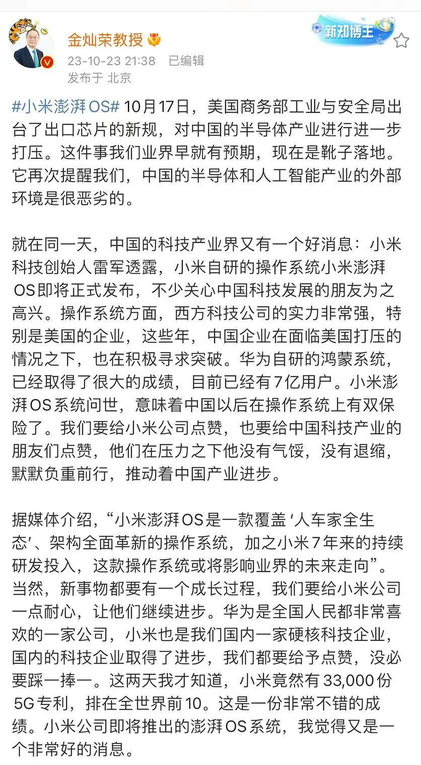 对那些在网上抛出质疑的人,金灿荣教授也做出了回答。他表示,小米新系统的研发并不是为了对抗华为,而是为了满足用户需求。同时他呼吁大家以理性的态度看待这款全新系统,因为任何新产品在推出时都会面临各种疑虑和质疑,我们应该以公平公正的态度去对待,而不是把所有的质疑都当作是恶意的抹黑。