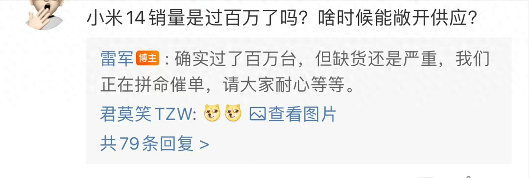 11月7日,小米公司创始人、董事长兼CEO雷军在社交平台上互动,表示:确实过了百万台,但缺货还是很严重,我们正在拼命催单,请大家耐心等待。