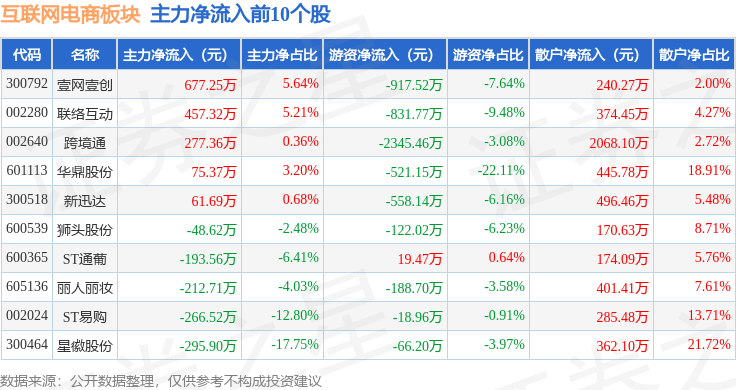 从资金流向上来看,当日互联网电商板块主力资金净流出2.08亿元,游资资金净流出7571.1万元,散户资金净流入2.83亿元。互联网电商板块个股资金流向见下表: