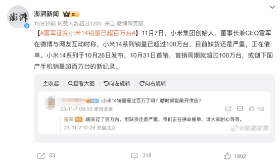 由于小米14系列实在太火爆,开售不到一周已经销量破百万,雷军都要在微博安抚用户,称目前缺货严重但在加急催单,请耐心等候,各位有没有后悔当时没有盲订呢?没买到的也不用着急,小米现在的生产速度还是可以的,品质也有保证,坐等发货就好了,早买早享受。