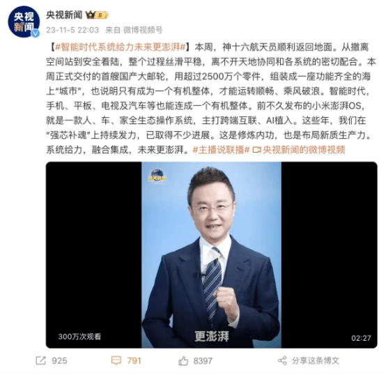 我国一直致力于“强芯补魂”事业,打造属于我国的芯片和操作系统,想要在这块核心技术有更多国产科技力量。此前华为Mate 60 Pro系列搭载自研麒麟9000S芯片,对帝国主义来个了正面碰撞,央视称赞其为“争气机”;现在小米也同时发力,全新操作系统小米澎湃OS将会完成「人车家全生态」格局,率先实现多设备跨端互联,对此央视也是点名称赞,称小米澎湃OS融合集成,未来更澎湃!