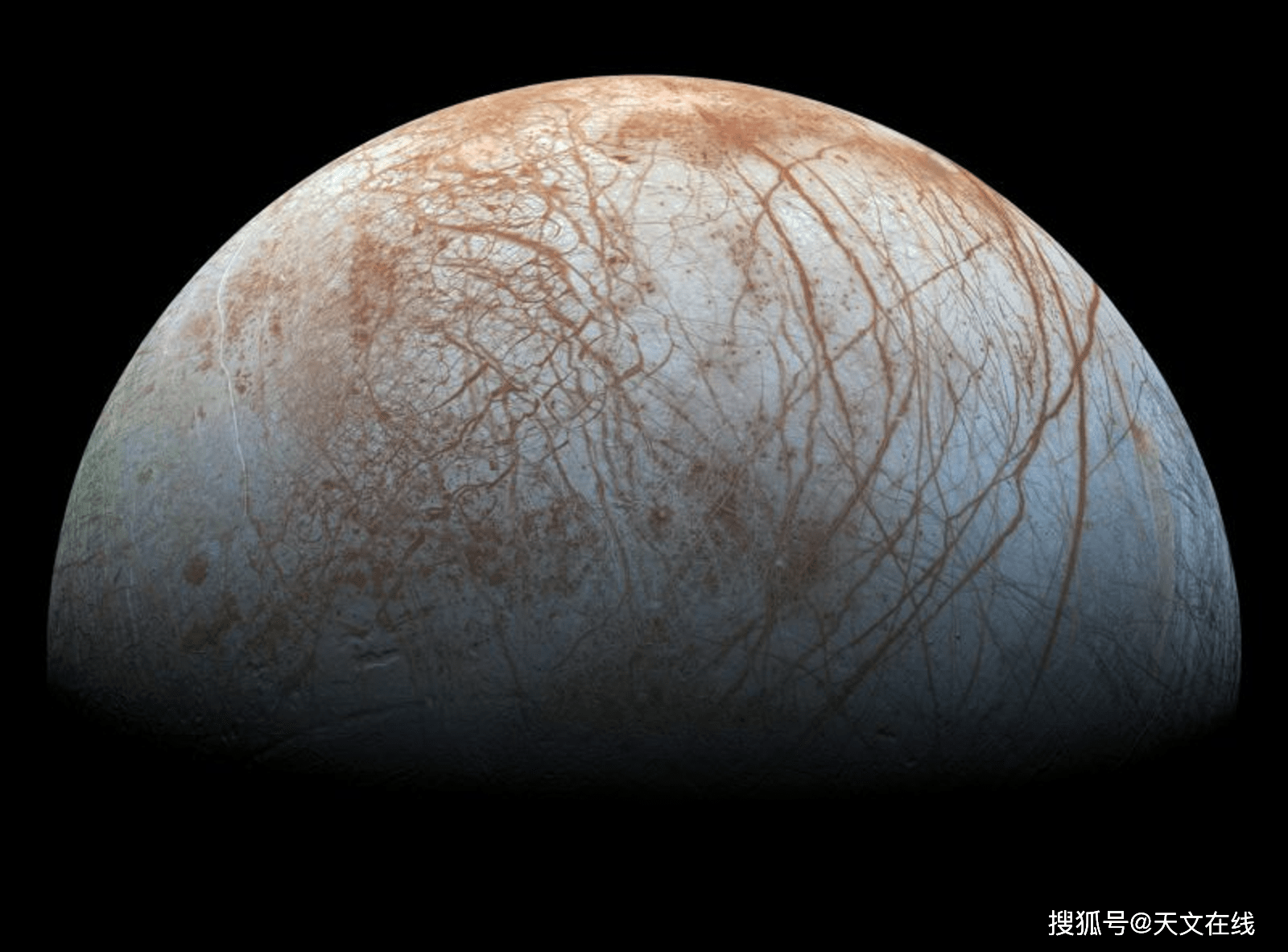 木星的卫星木卫二是太阳系中除地球外最著名的海洋世界。这张木卫二的图像是伽利略号宇宙飞船在1995年和1998年拍摄的图像合成的。看到木卫二表面那些纵横交错的裂缝和山脊了吗?它们使月亮看起来像一个开裂的鸡蛋。图片来自NASA/ jpl -加州理工学院/ SETI研究所。