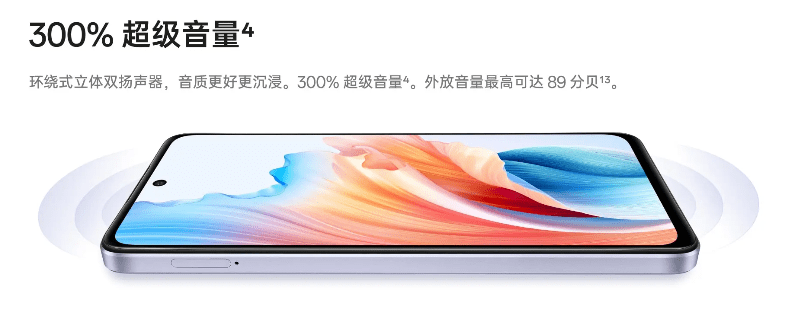 如果说千元机有什么遗憾的话,那肯定是有些方面有取舍,像是大家不太注意到的扬声器方面。而黑厂OPPO却选择了不阉割的做法,OPPO A2搭载了立体环绕双扬声器配置,在影音沉浸感方面会更强,并且OPPO A2还贴心的设计了300%的超级音量设计,不用担心来电漏音了,并且还针对高音场景做出了优化,确保了大音量下不过曝,保证了音质,影音体验更爽快。