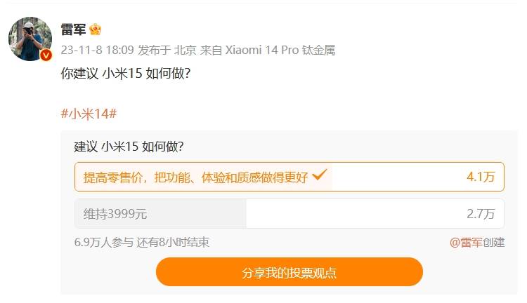 小米 14 系列自发售起就热度非凡,推出至今销量已经超过百万台,与此同时,雷军也已经开始为下一代小米 15 做准备。日前,雷军在微博就“小米 15 如何做”向网友发起了提问,目前有超过 4 万网友选择了“提高售价,把功能、体验和质感做得更好”选项,而选择维持“维持 3999 元”的仅有不到 3 万人。
