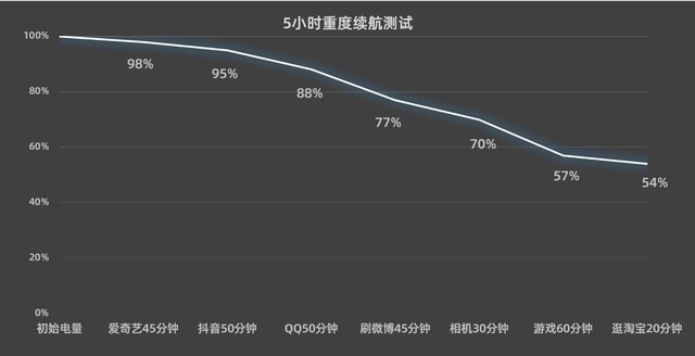 续航方面,我们采用中关村在线5小时重度续航测试模型,对其进行了续航测试。在当前室温环境下,连接办公室Wi-Fi,关闭蓝牙、GPS,屏幕亮度、音量均设为50%,结果如下: