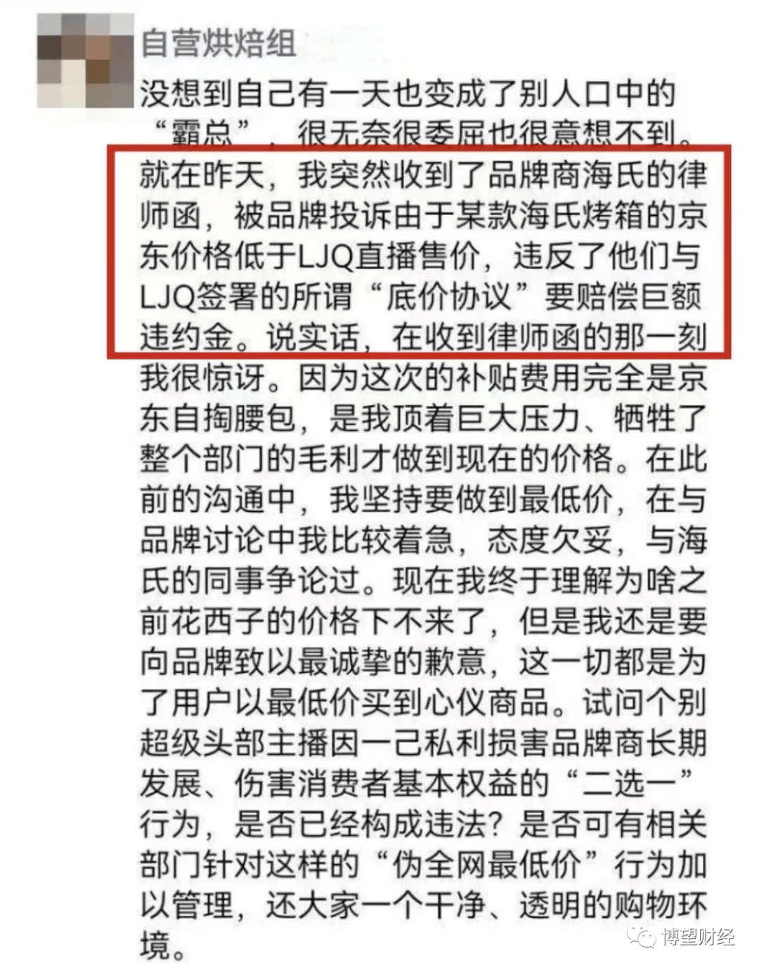 在刚刚过去的“二选一”事件,京东采购不仅直接戳破了李佳琦“全网最低价”的滤镜,而烤箱品牌和主播签订的‘底价协议“也露出水面,虽然美ONE方面否认没有签订所谓的底价协议,也从未要求品牌方进行二选一,但在后续《新浪科技》曝光的《美ONE直播推广服务合同》中却有明确相关条款:“品牌方需要保证促销力度保证期限内同等条件下的最大力度,如其他渠道高于直播间需赔偿200万违约金,并向消费者退还5倍差价。”