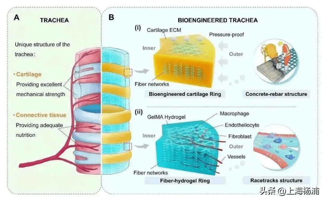 此外,陈昶教授团队和浙江大学贺永团队合作,基于3D打印超细纤维网络支架构建一种生物工程气管,同时模拟天然气管的解剖结构和生物功能,并形成益于再生的免疫微环境,在实验动物气管缺损模型的修复中展示出较高的临床潜力。相关工作“A bioengineered trachea-like structure improves survival in a rabbit tracheal defect model”发表于《科学转化医学》(Science Translational Medicine)。