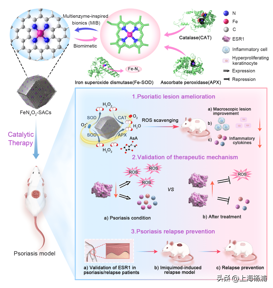 近日,同济大学医学院、附属第十人民医院施剑林院士/逯向雨助理教授团队联合同济大学附属皮肤病医院院长李斌团队和董海青团队在《自然·通讯》(Nature Communications)上发表题为“Single-atom catalysts-based catalytic ROS clearance for efficient psoriasis treatment and relapse prevention via restoring ESR1”的研究论文。该研究基于多酶仿生学,模仿多种天然酶的活性中心,开发出具有活性氧清除能力的仿生单原子铁催化剂,有效地改善了银屑病的炎症并防止其复发。