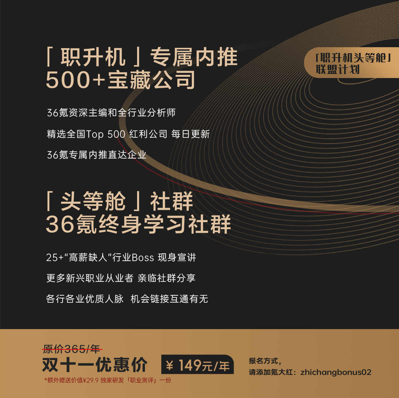 其中包含36氪主编团队精选的Top500 红利公司和内推权益,以及36氪终身学习社群——「头等舱」社群。