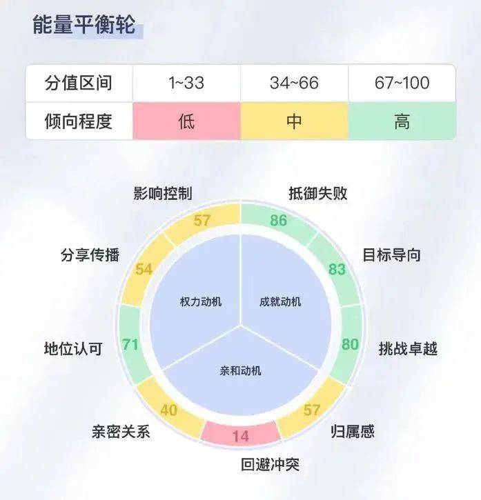 本套测评共63题(相比于极其考验耐心,动辄上百道题的测评,63题是更合理且不损失真实度:一个平衡的题量),将衡量出你的三大社会化动机“成就、亲和、权力”的各自倾向,以及三大动机之下九大胜任力的倾向水平,帮助你更精准地评估自己的优势、弱势。
