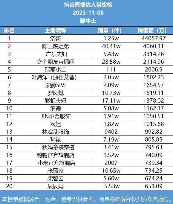 11月8日,抖音直播达人带货榜一是洛哥,销售额44057.97万;榜二陈三废姐弟,销售额4060.11万;榜三广东夫妇,销售额3314.26万。