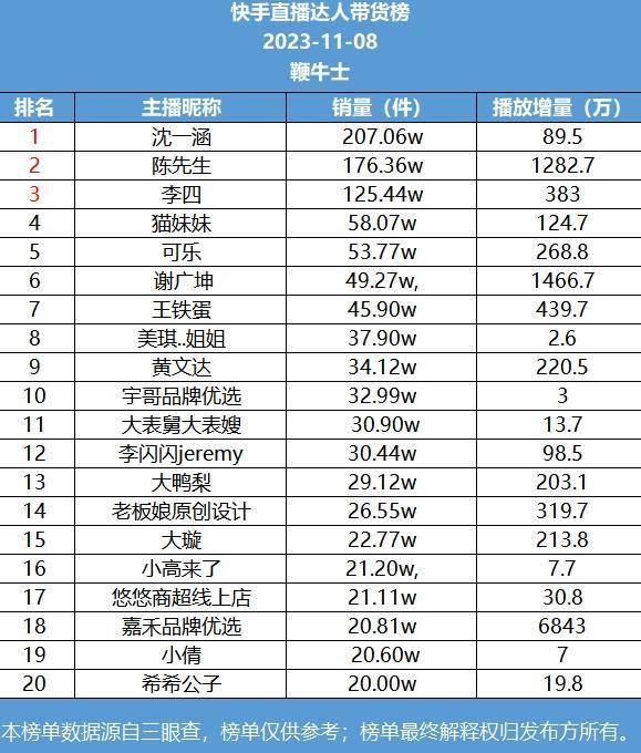 快手榜一是沈一涵,销量207.06万件;榜二是陈先生,销量176.36万件;榜三李四,销量125.44万件。