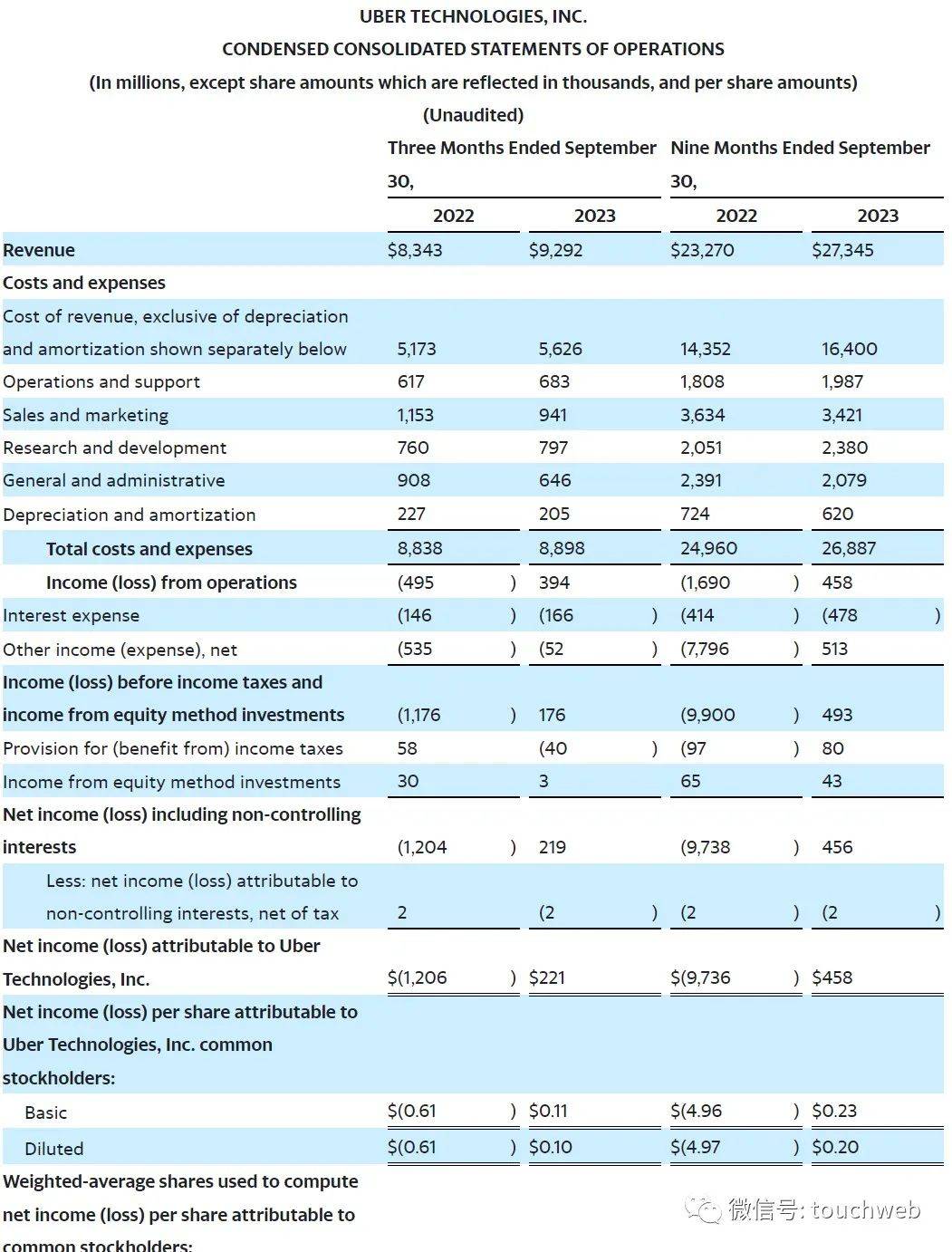 Uber在2023年第三季净利2.21亿美元,上年同期净亏损为12.06亿美元;经调整EBITDA为11亿美元,上年同期的经调整EBITDA为5.16亿美元。
