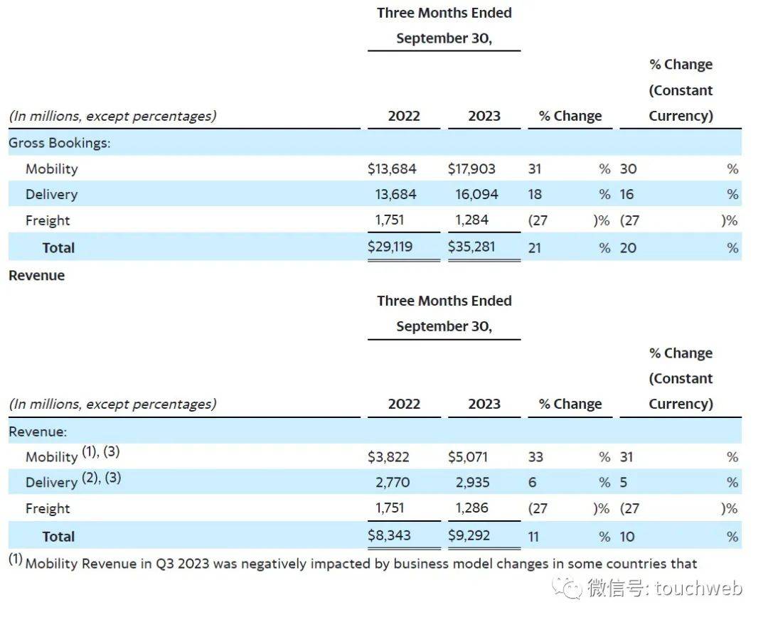 其中,Uber在2023年第三季度来自出行的收入为50.71亿美元,较上年同期的38.22亿美元增长33%;来自送餐业务的营收为29.35亿美元,较上年同期的27.7亿美元增长6%;来自货运(Freight)收入为12.86亿美元,较上年同期的17.51亿美元下降27%。