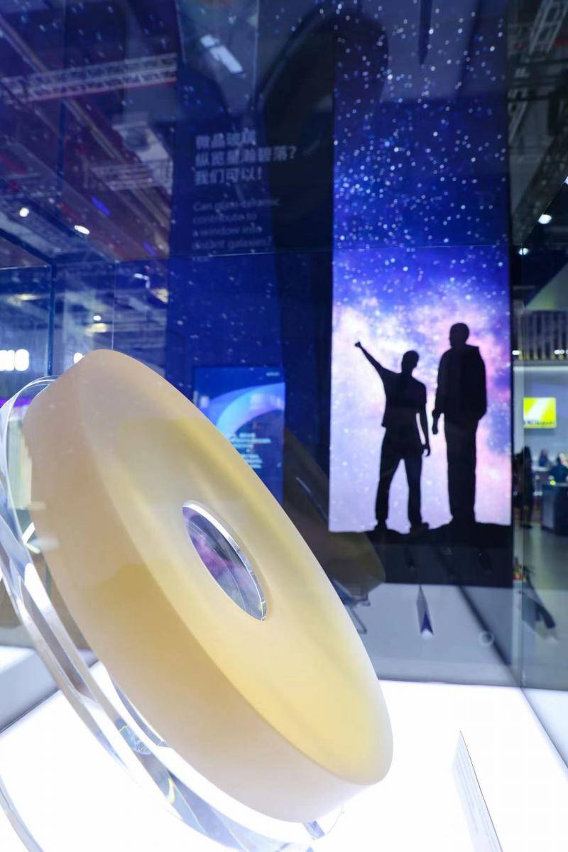 在肖特展台上,造型犹如和氏璧的展品设计最中央的就是肖特本次进博会上的明星产品——肖特零度微晶玻璃。它被使用在目前世界上最大的光学望远镜欧洲极大望远镜ELT(在建)上,作为“天文望远镜的视网膜”使ELT能够比人眼接收多一亿倍的光,这能让天文望远镜的“视野”更广,“看”得更为清晰。
