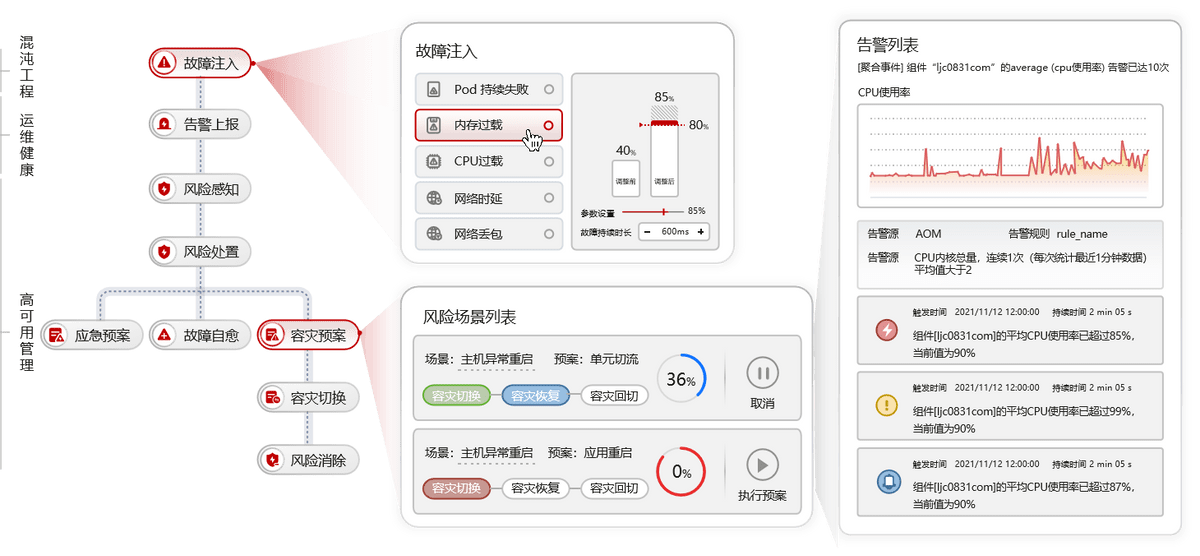 通过华为内部混沌工程应用外溢打造的华为高可用管理平台提供10+类故障场景、200+故障模式和20+容灾预案管理方案,更好帮助客户容灾管理,提升业务系统高可用能力。