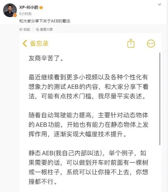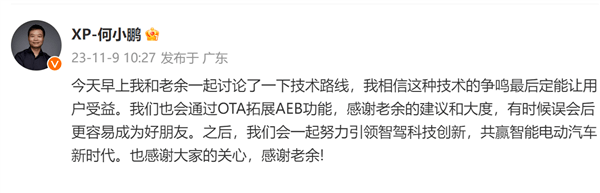 11月9日消息,何小鹏官方给出的消息显示,争吵了快一周的AEB技术可以告一段落了,因为他们余承东握手言和。