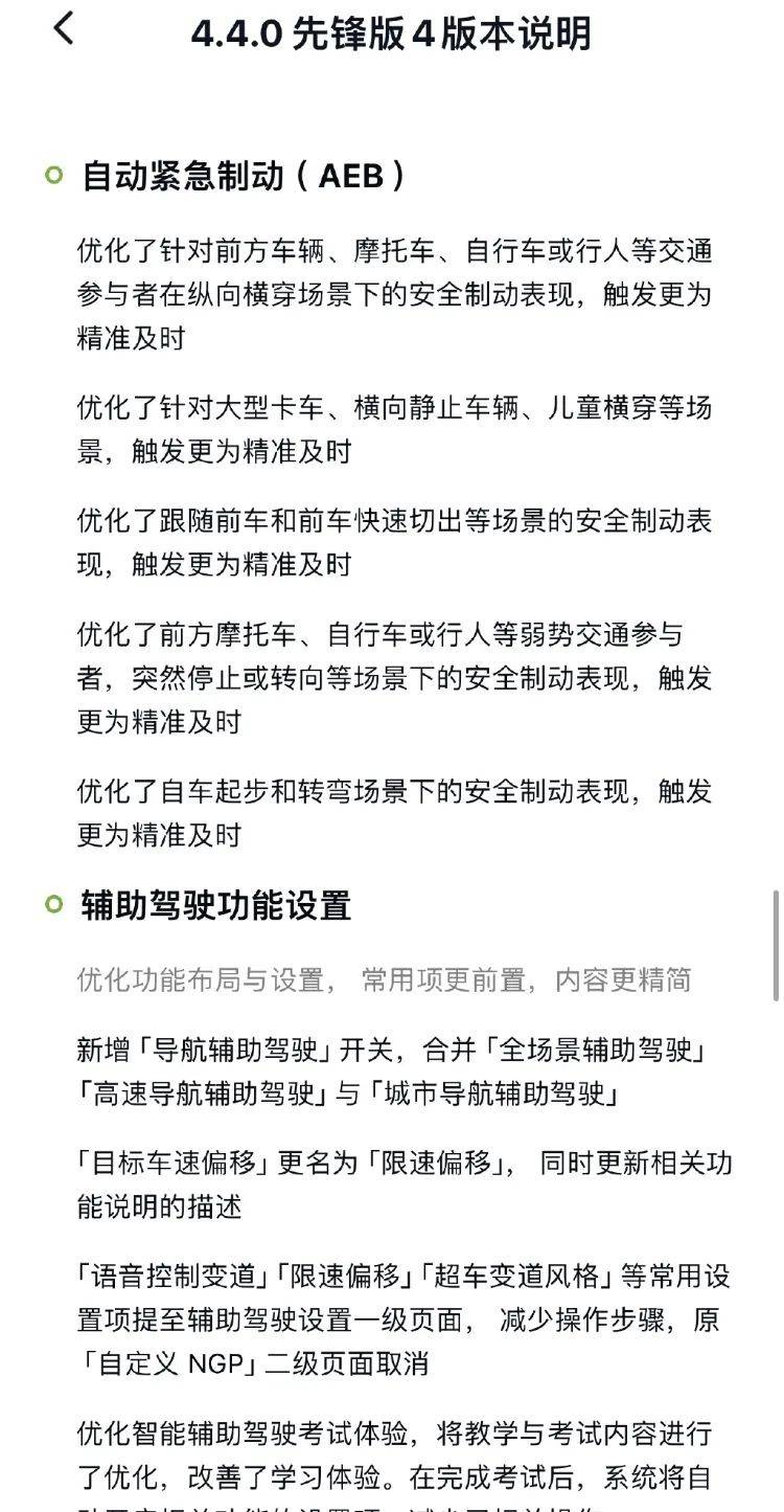 因此,小鹏当天连夜推送了最新的 Xmart OS 4.4.0 先锋版更新,其中涵盖优化AEB表现,包括优化了多个场景下的安全制动表现,使得触发更为精准及时。