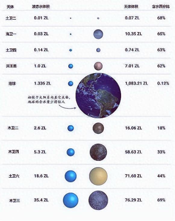 在讨论一颗星球的蓄水量时,天文学家通常会使用到“ZL”这个巨大的单位,根据定义,1ZL等于10的21次方升。在太阳系中,蓄水量排名前四的星球分别是木卫三、土卫六、木卫四和木卫二,它们的蓄水量分别为35.4ZL、18.6ZL、5.3ZL、2.6ZL,而我们的地球的蓄水量则为1.335ZL,只能排到第五名。