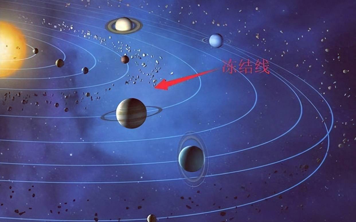 由于太阳的热辐射会随着距离的增加而减弱,这样就会形成一种被称为“冻结线”的临界距离,在“冻结线”之内,由于距离太阳较近,像水这样的具有挥发性的物质大多只能以气态存在,而在“冻结线”之外,由于距离太阳较远,水就会凝结成冰,变成固态物质。