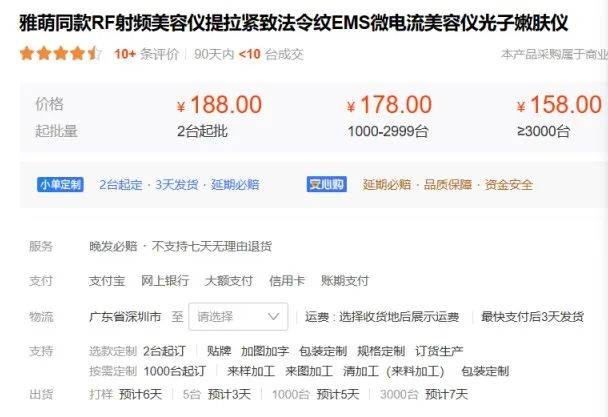 企查查数据显示,我国现存8.4万家美容仪相关企业,超一半企业成立于近3年。而这其中,不乏提供贴牌代工服务的厂商。锌刻度此前就曾调查发现,不少厂商提供的美容仪商品目录和报价都显示,代工贴牌的价格可以低至100元-300元。