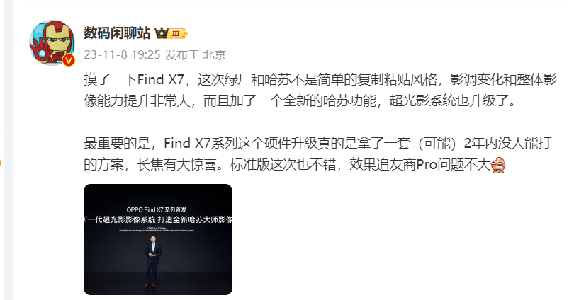 而且,站哥还透露称,“这次绿厂和哈苏不是简单的复制粘贴风格,影调变化和整体影像提升非常大,并加了一个全新的哈苏功能,超光影系统也升级了”,更是直接表示,OPPO Find X7系列这个硬件升级真的拿了一套(可能)2年内没人能打的方案。影像实力着实很让人期待了。