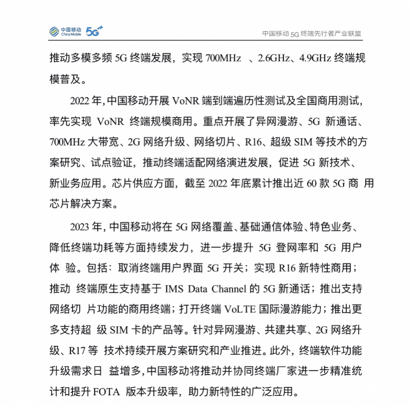 不过南都湾财社记者梳理发现,从各大运营商发布的行业白皮书来看,它们似乎确实存在对“关闭5G开关”的意愿。如中国移动在其发布的5G手机产品白皮书(2023年版)中提到过有关问题,中国移动方面指出,2023年其将在5G网络覆盖、基础通信体验、特色业务、 降低终端功耗等方面持续发力,相关行动中就包括了取消终端用户界面5G开关,目的则是为了进一步提升5G登网率和5G用户体验。