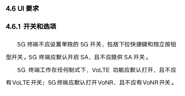 此外,中国联通也在《5G终端白皮书(第六版)》中也明确写道,5G 终端不应设置单独的 5G 开关,包括下拉快捷键和独立按钮型开关。且根据白皮书附录介绍,中国联通有关于“5G开关”的要求是在2021年3月发布的第四版白皮书中便已进行添加修订的。
