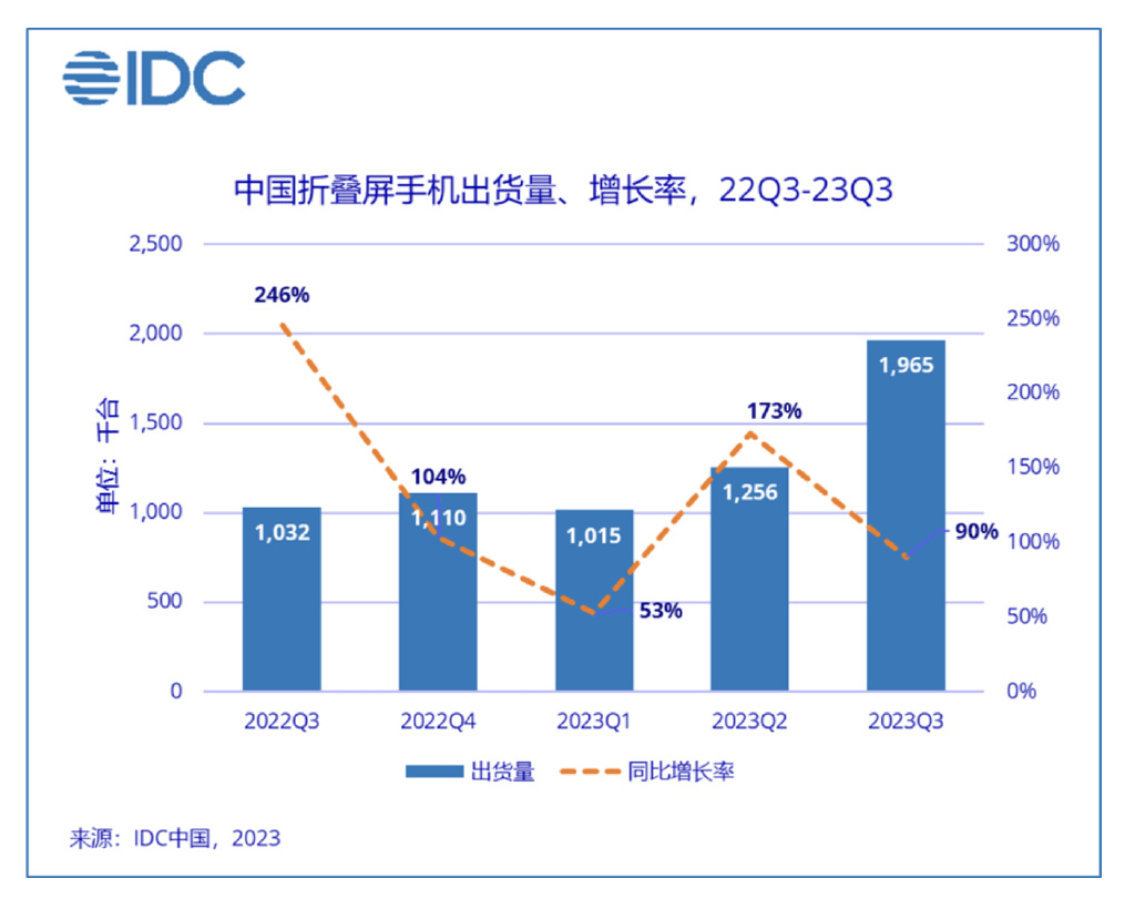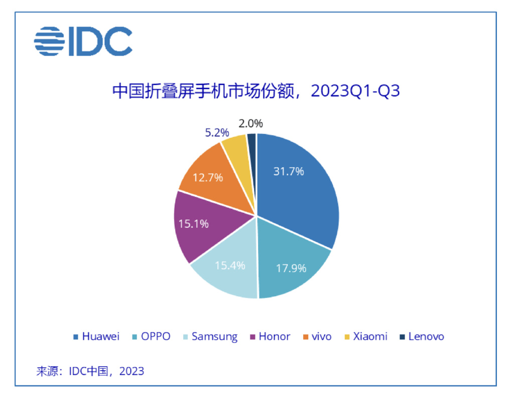 对比起直屏机,折叠屏就显得来势汹汹,呈现出逆势上涨的趋势,根据IDC发布的数据来看,仅第三季度国内折叠屏出货量就达到了196万台,同比增长90.4%。在市场份额上,国产品牌表现相当亮眼,三星被后来居上的OPPO正常挤下,位居第三,而OPPO则是占据了榜单TOP2的位置。