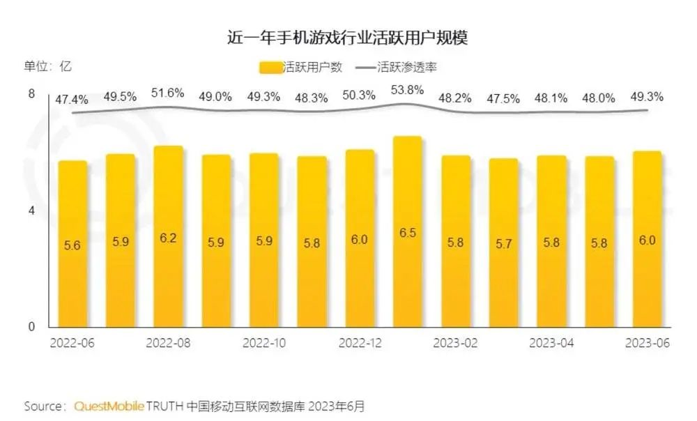 根据QuestMobile公布的《2023手机游戏行业洞察报告》,截至2023年6月,我国手游用户月活规模达到6亿,并且长期稳定在50%左右。也就是说,我国约50%的移动互联网月活用户都是手机的高活跃度使用者。