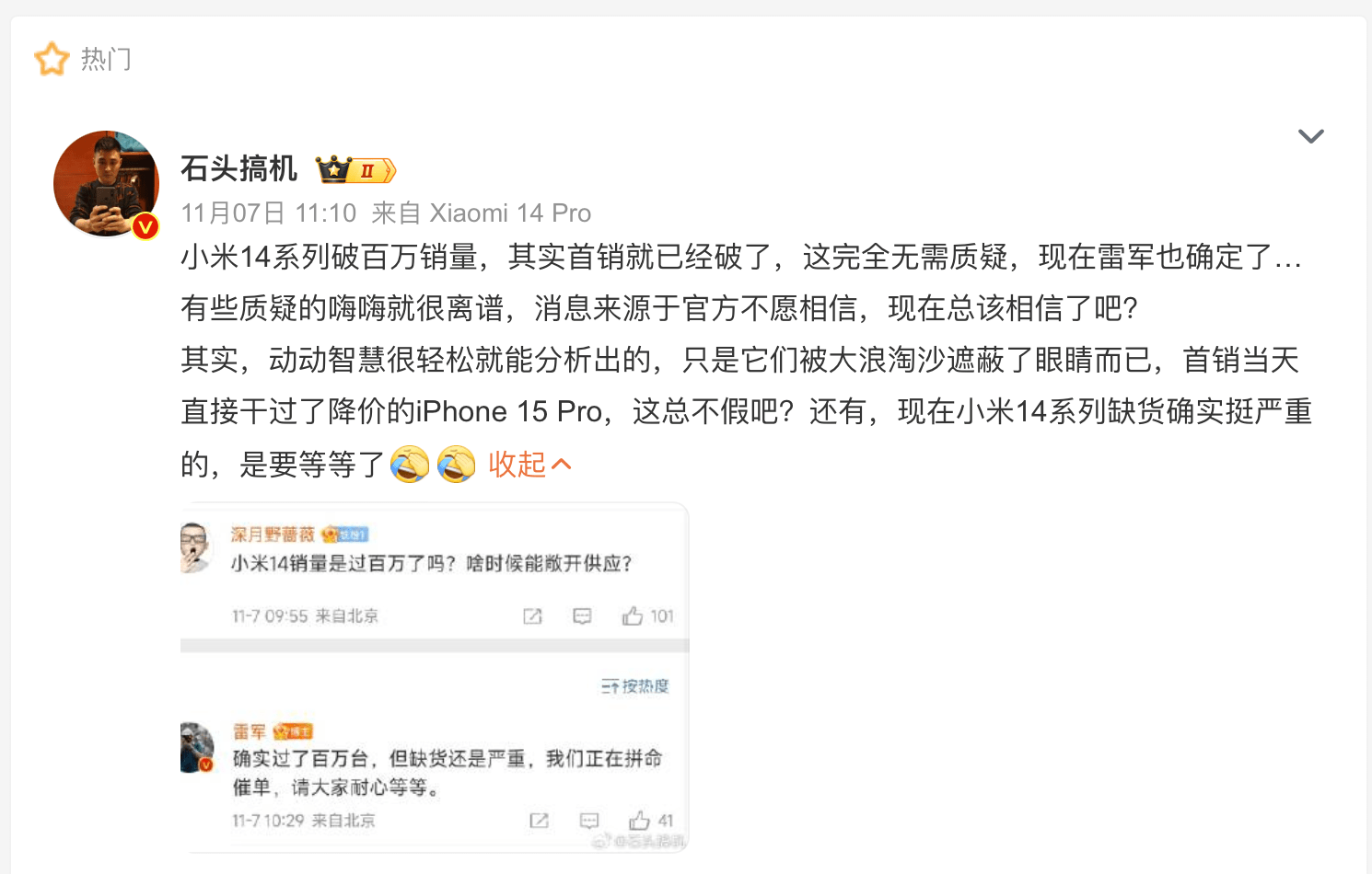 得益于出色且全面的软硬件体验,小米14系列大卖,也是意料之中的事情。但有点遗憾的是,雷军都低估了消费者对小米14系列的受欢迎程度,备货量还是不太够,不少消费者都在线催单,小米要抓点紧了!