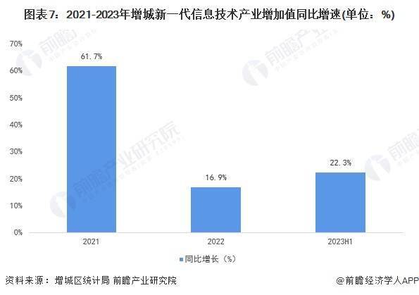 2021-2023年,增城新一代信息技术业的增加值逐年增长,年增速一直保持在全市第一的水平。到2023年上半年,由于超视界市场回暖和维信诺产能释放的影响,增城新一代信息技术业的增加值达到15.84亿元,同比增长22.3%。