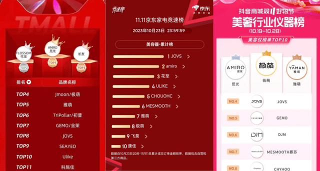 2023年10月31日晚八点,天猫双11购物节的大幕准时拉开,美容仪器如同一支蓄势待发的箭,在天猫平台上,实现了超800%增长。京东、抖音等电商平台上的美容仪器也呈现持续高增长的趋势,往年在小家电行业、美容个护行业榜单中零星可见的美容仪器品牌,今年“来势汹汹”。