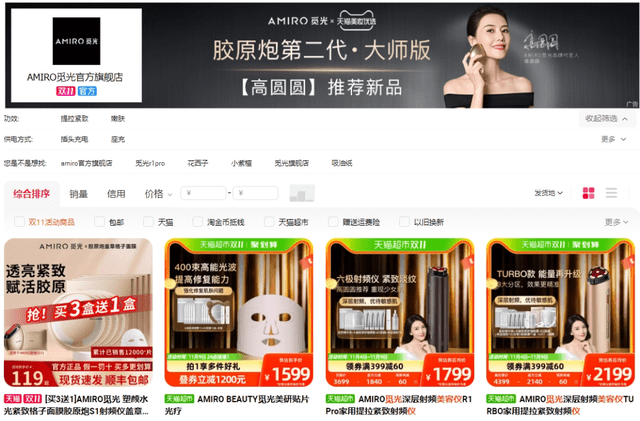 射频美容仪品牌觅光也不甘示弱,不仅在购物狂欢节预热阶段,就开始全力推广新品“AMIRO觅光胶原炮第二代”以及“AMIRO觅光大排灯Max”;为了吸引更广泛的关注,还邀请了高圆圆、王子文、蔡少芬、蔡卓妍、钟欣桐、张雨绮、曾黎等一大批人气明星进行代言或推荐。