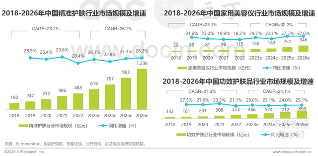 据艾瑞咨询研究报告显示,预计到2026年,国内精准护肤行业市场规模高达1236亿元、家用美容仪行业市场规模将达到346亿元。