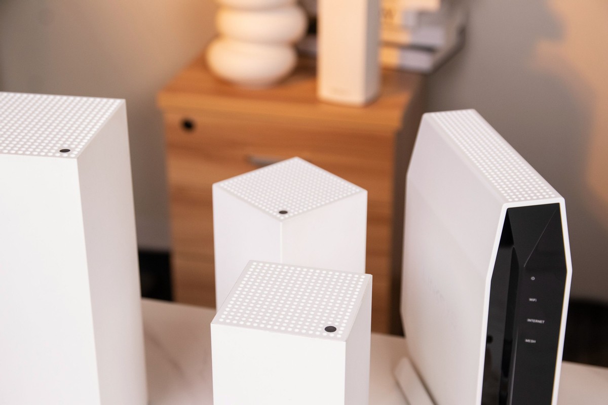 其中三款方方正正的无线路由器属于家用系列,纯白的机身配色,加上内置天线设计,让无线路由器放在家居中完全不突兀,甚至有点像装饰品。这里面个头比较大的领势MX4200分布式路由器就是旗舰款型,它比较适合大户型或别墅家庭使用,并且由于它拥有丰富的功能和先进的配置,身边不少网络极客都不约而同选择了它。