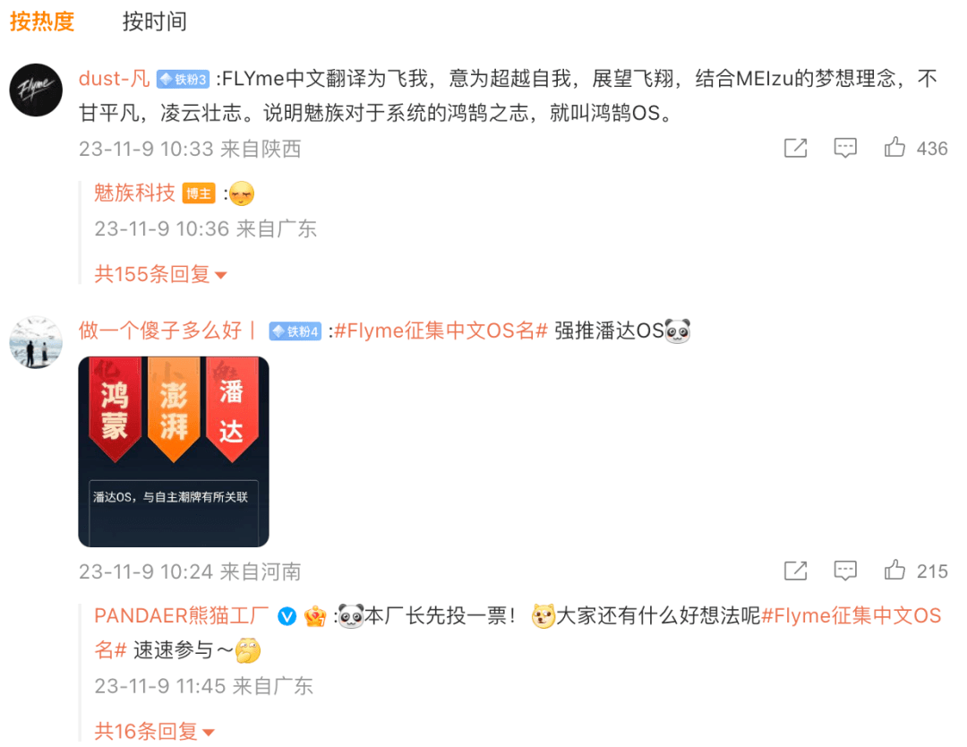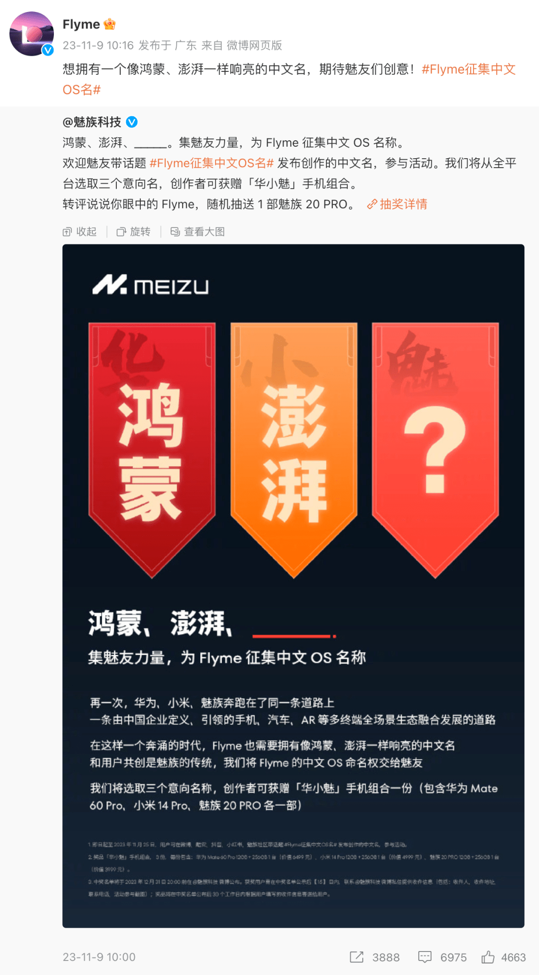 魅族表示Flyme也需要拥有像鸿蒙和澎湃一样响亮的中文名,参与命名征集的创作者有机会获赠「华小魅」手机组合一部(华为Mate 60 Pro、小米14 Pro、魅族20 Pro各一部)。
