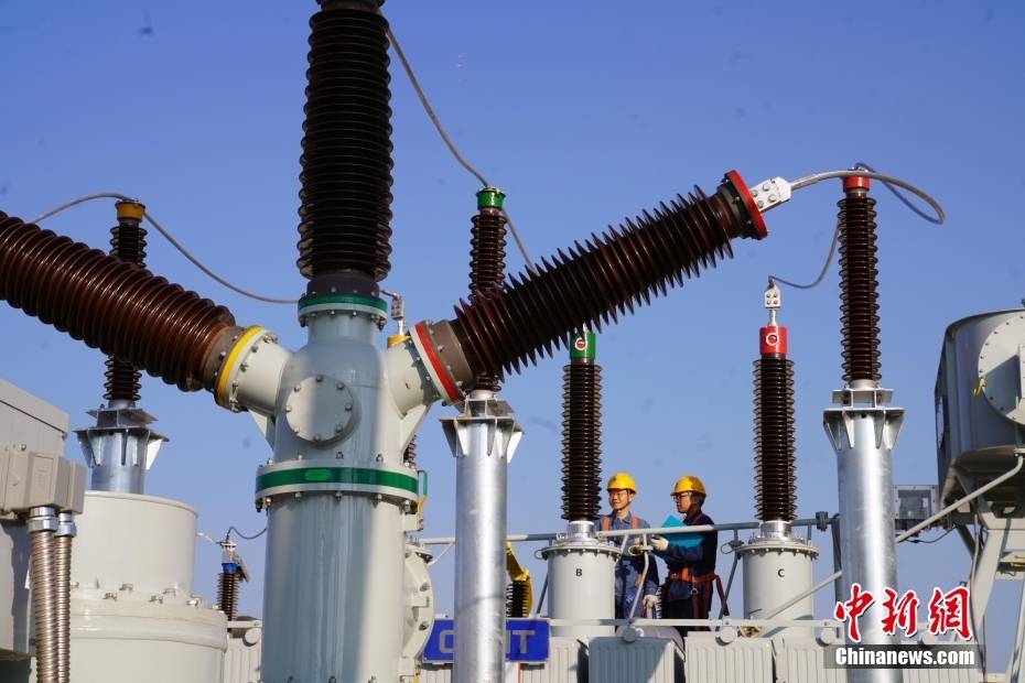 11月7日,国网绍兴市上虞区供电公司员工在浙江上虞盖北镇龙昕110千伏储能电站1#主变上检查变压器套管,并对所有开关压板和保护定值区状态进行核对,及时消除各类设备隐患缺陷,确保设备保持健康运行状态,为龙昕储能电站如期投运做准备。中新社发 孟永平 摄