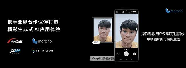 Morpho的视频通话实时数字分身生成技术,同样基于天玑9300 APU边缘计算能力,对比前代,性能提升26%。一般的虚拟人像生成器需手动选取容貌样式花费时间。但基于视频通话实时数字分身生成技术,用户操作容易,仅需打开摄像头单帧图片即可瞬间生成数字分身。