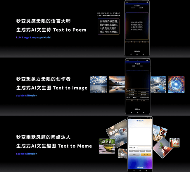 天玑9300还支持多模态生成式AI大模型,打造出“文生诗”“文生图”“文生趣图”等丰富有趣的端侧体验。