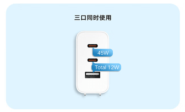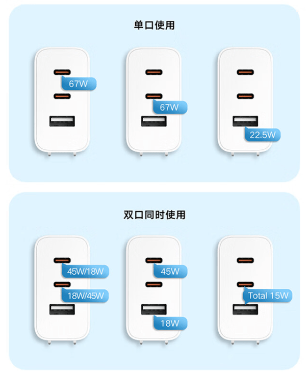 小米三口 GaN 充电器采用 1A2C 的接口设计,单口最高支持 67W 充电功率,双口、三口同时使用时,单口最高支持 45W 充电功率。