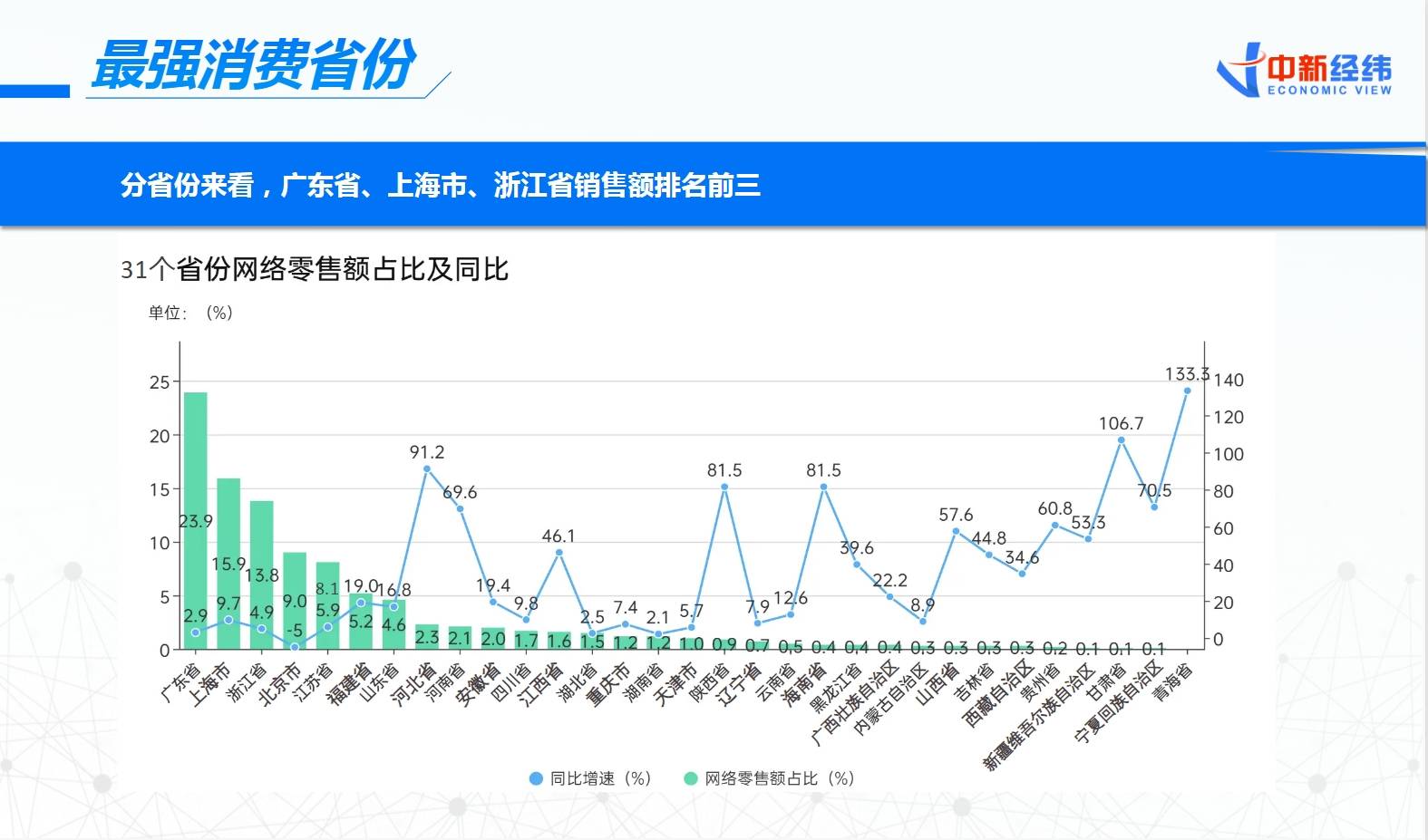 从各省份网络零售额占比及增长情况看,广东省、上海市、浙江省销售额排名前三,占比分别达到23.9%、15.9%、13.8%;青海省、甘肃省、河北省销售额同比增速排名前三,分别为133.3%、106.7%、91.2%。