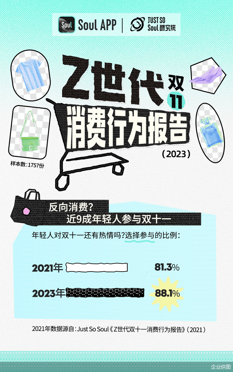 那么,年轻人究竟是否还有参与双十一的热情?根据《2023 Z世代双十一消费行为报告》(以下简称“报告”),今年有88.1%的年轻人参与双十一大促。2021年,Soul同样发布了《Z世代双十一消费行为报告》,数据显示,当年参与双十一的比例为81.3%。