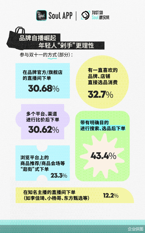 如今,在直播间下单已经成为年轻人线上消费的主要形式。在此次的调研中,也可以看到品牌自播直播间崛起的趋势,有30.68%的消费者通过此方式参与双十一,多于在头部主播直播间下单比例(12.2%)。