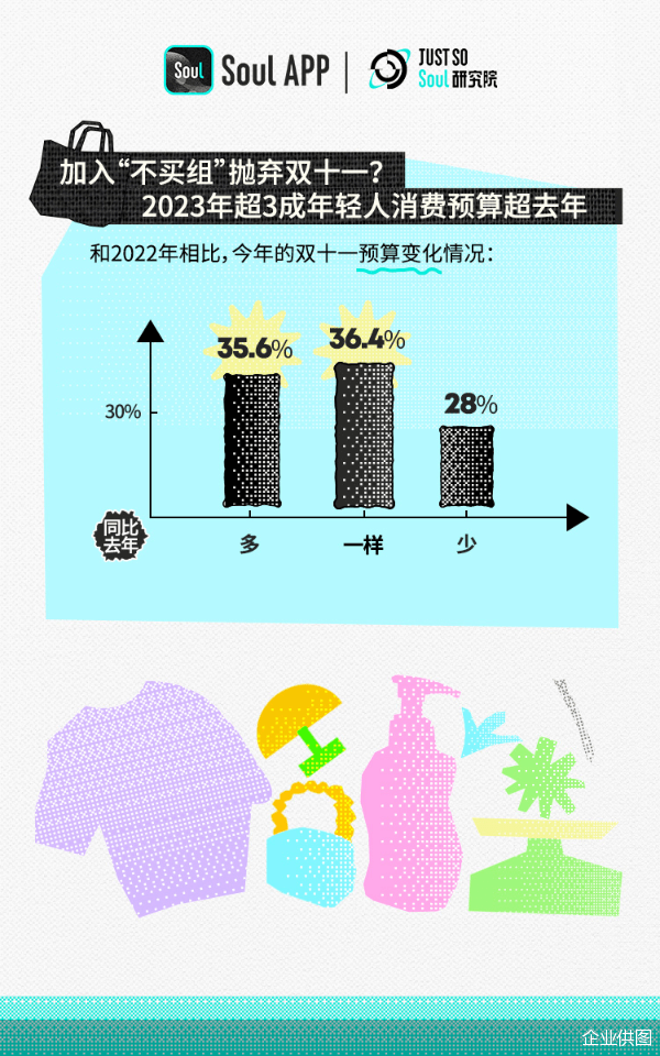 在双十一消费金额安排上,《2023 Z世代双十一消费行为报告》显示,35.6%的年轻人今年消费预算比2022年双十一更多,36.4%则与去年持平。