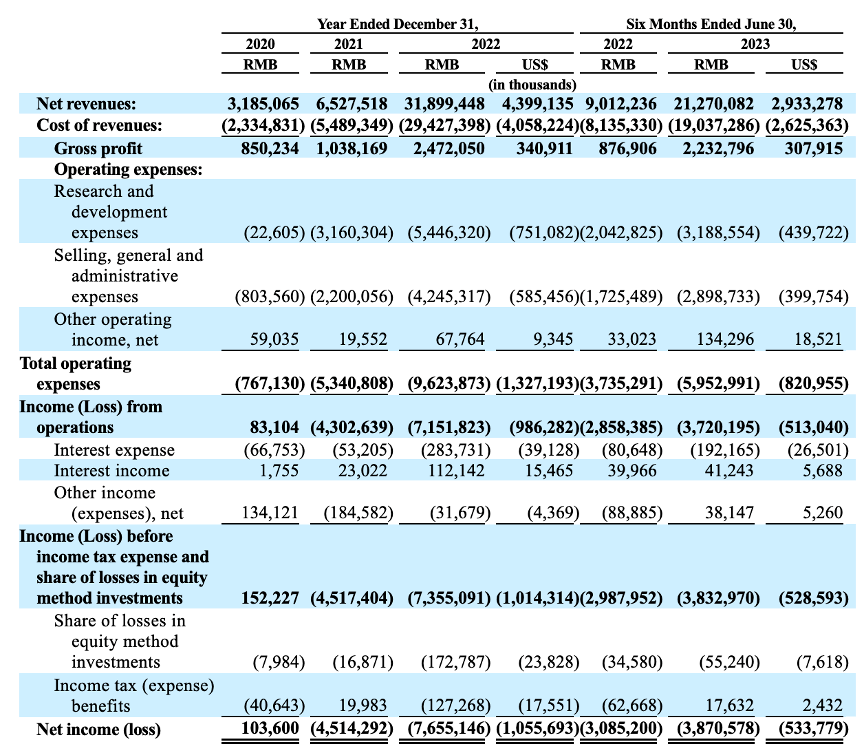 值得注意的是,毛利率方面,2023年上半年极氪整车毛利率达到12.3%,同比增长7.6个百分点。对于一家刚成立不久的新势力而言,这一毛利率水平比较亮眼。