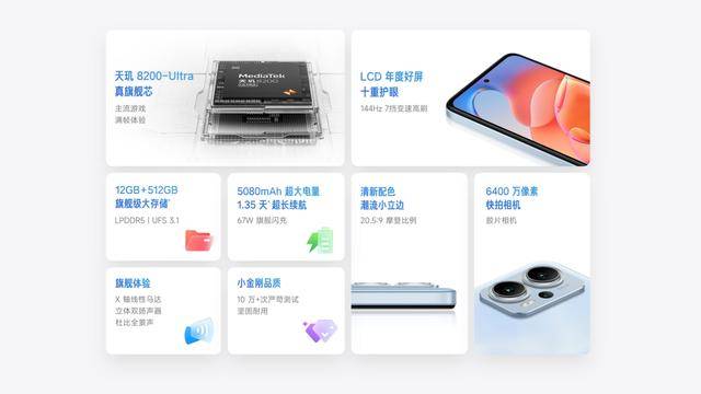 这是一款采用LCD屏幕的千元机,8GB+256GB版售价1379元,并且在性能、快充和影像上有不错的表现。性能方面是天玑8200,可以畅玩大部分主流游戏,续航配置是5000毫安时和120W闪充。