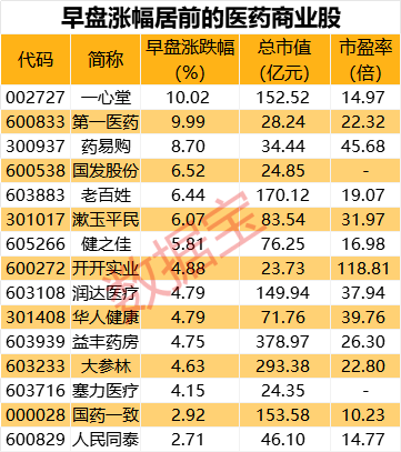 11月10日早盘,A股医药商业板块显著反弹,一心堂、第一医药涨停,药易购、国发股份、老百姓、漱玉平民、健之佳涨幅均在5%以上。