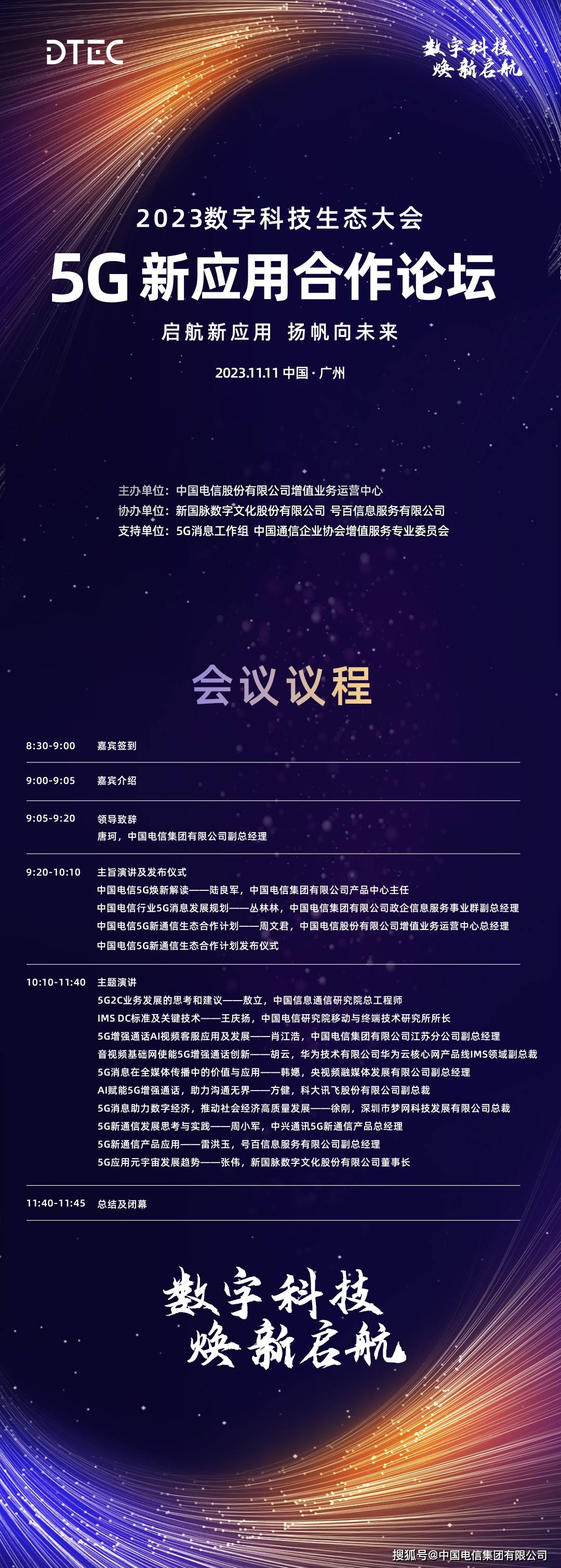 原标题:启航新应用 扬帆向未来 | 2023数字科技生态大会 5G新应用合作论坛会议议程